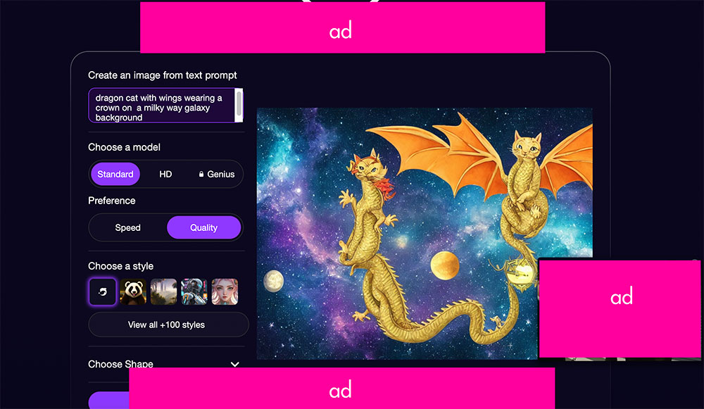 Since it is a free platform, there are Google ads that pop-up but they are not as bad as Deep AI. Overall, it is easy to use, fast and you are supposed to be able to download HD file.