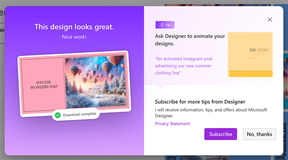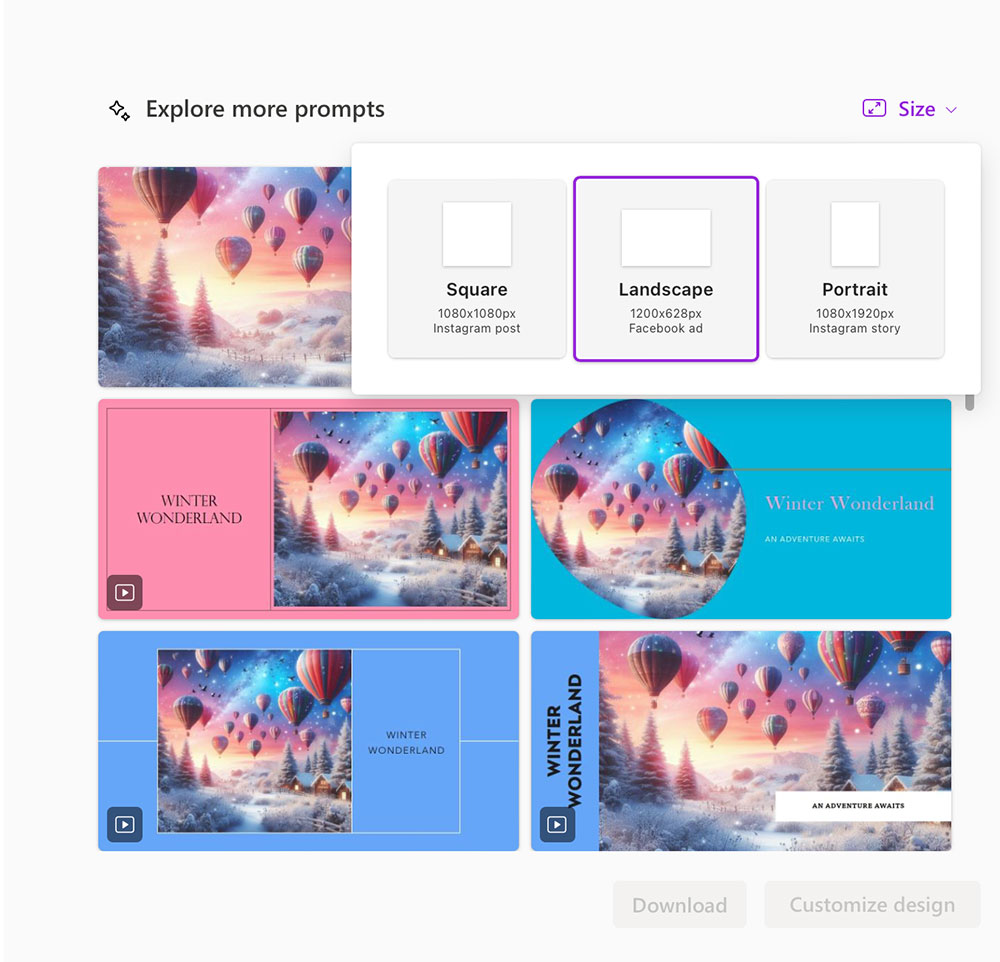 The great thing is that you can immediately create a design using the image that you generated. There are some templates that you can choose to create a quick layout with custom text using design.microsoft.com.
